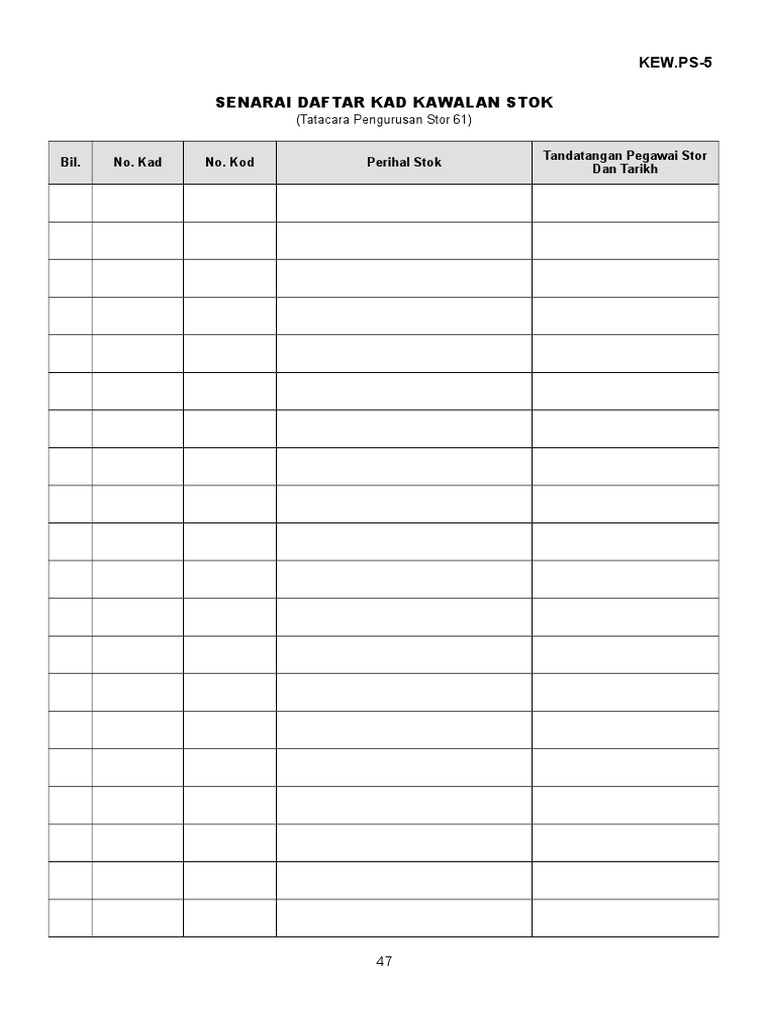 For more information and source, see on this link : Borang yang digunakan di stor utama dan stor unit. Sub modul penyelenggaraan unit ukuran kategori barng barang lokasi stor pusat lokasi stor ptj barang stor pusat barang stor ptj Tahun pertama kedua ketiga keempat kuantiti nilai (rm) kuantiti nilai (rm) kuantiti nilai (rm) kuantiti nilai (rm) keluaran stok suku tahun Sub modul tambah stok stor pusat stor ptj 5. Borang daftar stok baru (kew ps 6) 14: 5.5 membuat pengesahan dengan mencatatkan nama dan tarikh pada akhir transaksi di kad daftar stok; Borang kad kawalan stok kew ps 3. Borang permohonan berwarna putih untuk rekod kad kawalan stok, borang permohonan berwarna hijau untuk rekod kad bin dan borang permohonan berwarna kuning untuk simpanan jabatan / fakulti setelah pengeluaran barang dibuat. Modul penyimpanan melakukan pendaftaran kad kawalan stok dan membuat penyimpanan stok. Senarai daftar kad kawalan stok (kew ps 5) 13: Bahagian bekalan kawalan dan akaun. 5.2 semua kad kawalan stok dan kad petak hendaklah dikemas kini setiap kali.