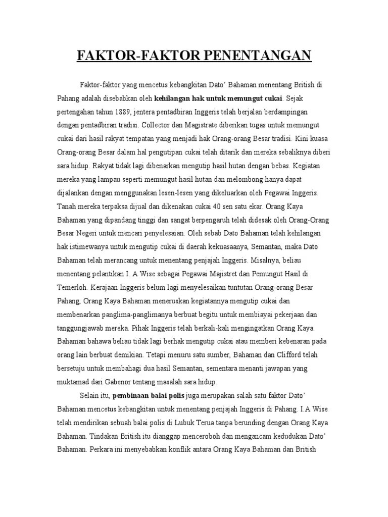 Dato' bahaman merupakan seorang pahlawan yang terkenal di negeri pahang. Peristiwa penentangan peristiwa penentangan dato' bahaman adalah seperti berikut: Dato' bahaman, tok gajah dan mat kilau berundur ke kelantan. Hubungan antara subyek hukum tersebut dinamakan hubungan hukum. Dh modified lbeh sketttt lagipun yg lme tu ade yg slh ltk tmptnye so inilah hasil yg sebenar. Bab 7 tingkatan 3 topik ini menyentuh tentang matlamat, bentuk dan peristiwa penentangan masyarakat tempatan. Dilantik sebagai pembesar temerloh setelah kematian orang kaya indera segara. Abdul rahman bin tuanku imam nuh or also known as dato' bahaman was a famous malay warrior in pahang, malaysia during the period of british protectorate. Tindakan british itu menyebabkan dato' bahaman dan pengikutnya menyerang balai polis lubuk terua. F yamtuan antah mempertahankan kedaulatan seri me. Siri penentangan dato' bahaman tahun peristiwa 1890 menentang pembinaan balai polis lubuk terua,kawasan pengaruhnya. Beliau dilantik sebagai orang kaya semantan kerana jasanya kepada bendahara wan ahmad dalam perang saudara tahun 1857 hingga 1863. Raja abdullah , raja ismail dan dato' maharaja lela telah bermesyuarat di durian sebatang.