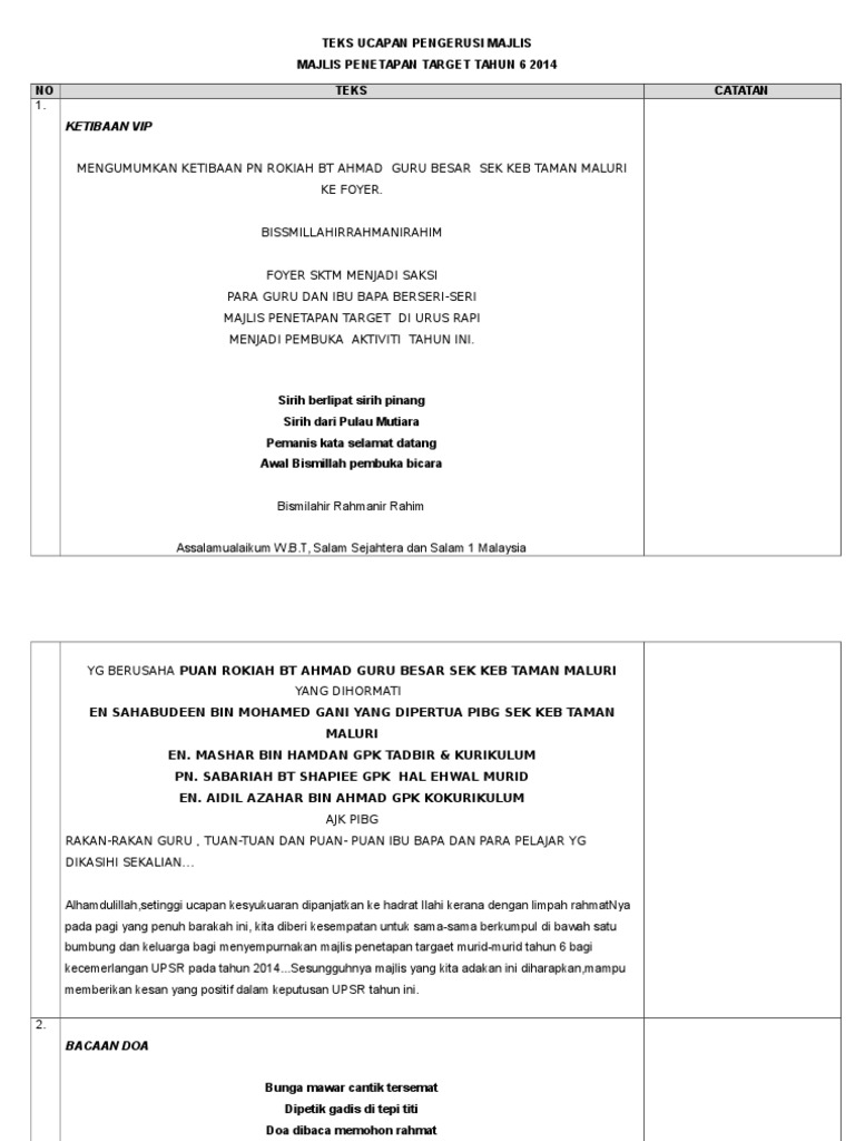 Yg berusaha puan rokiah bt ahmad guru besar sek keb taman maluri yang dihormati en sahabudeen bin mohamed gani yang dipertua pibg sek. By golden rose 37592 views. Datuk rosnah bte abdul rashid shirlin. Juga sesuai diubahsuai untuk program sambutan lain dan juga peringkat daerah serta kebangsaan. Teks pengacara majlis, mc untuk majlis sambutan maulidur rasul peringkat sekolah menengah dan rendah.